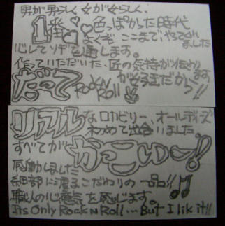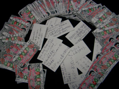 | 〜パンパカパ〜〜ン、パンパンパンッ パンパカパ〜〜ン♪〜 ども、どもっ皆様、おこんばんは〜。 たいへん永らくお待たせ致しましたっ! 今回はかなり激戦でございまして、特にNO.8におきましては、応募券が東京スカイツリーの高さを超えるか!? っとそこまでは行きませんよ、まったくもぉ〜。 所有枚数の多さと致しましては、お一人様で49マイというお方がKING OF KINGでございましたっ。 このような素晴らしいお方におきましては、ナッソースーツに身を包み、お年賀のタオルを持って、来春ご挨拶に参らないとなりません。また今回も大変スルドイご意見や企画を頂きまして、どうもありがとうございました。 ネットやケイタイメールで活字の世の中になりましたが、このような手書きの熱きメッセージこそナマミがあり、ジ〜ンっとくるもので、何よりの励みとなるものであります。 んなわけでございまして、この時期、死ぬほどお忙しい佐川急便の岩渕ドライバーにお越しいただき、うぅらみっこ無ぁしよ、アップップ!! っつう事でとにかくナンも考えず一発ツモしていただきましたっ。 これより発送業務が待っておりますので、今回はこれにて失礼させていただきます。当選された方々、おめでとうございまーす! そうでなかった多くの方々におきましては、どうかここはお気を落とされることなく、何卒何卒、宜しくお願い申し上げます。 |