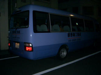 | 送迎バスがご到着。船着場までテクテク歩いてもいける距離でもあるが、そこはエラソ〜なバスコースを選ぶ。ちなみに船宿の事務所はTHE KINGから歩いて1分。 | キブンはカンゼン大人の遠足状態。おやつは一人800エン まで だとか!? いや、おやつはいいから早く酒をくれ! ってな連中ばっかだ。 |