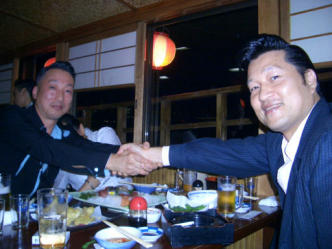 | ファラオの高杉氏と尾形直人氏は共に北海道北見市出身という事 が判明。トウゼン意気投合で、ガッチリ握手! |