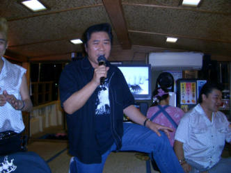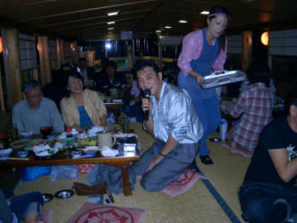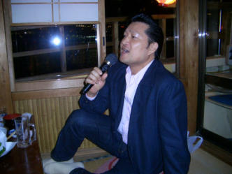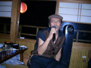 ノリノリの柳谷先生。もうここからは唄、唄、唄! | マイクを握るのは副宴会部長の入江正木さん。 アタシャと名でも縁があり! |