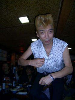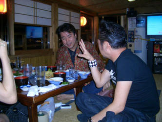 | お世話になっている業者さまとノリのイイ調布からの面々。 | 柳谷先生、力説中。ロカビリー対談か?手前左の西村専務は THE KINGのダンボールでもお世話になってるお方。 |