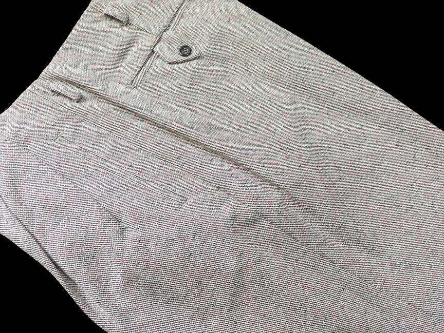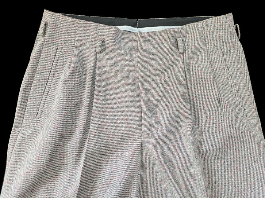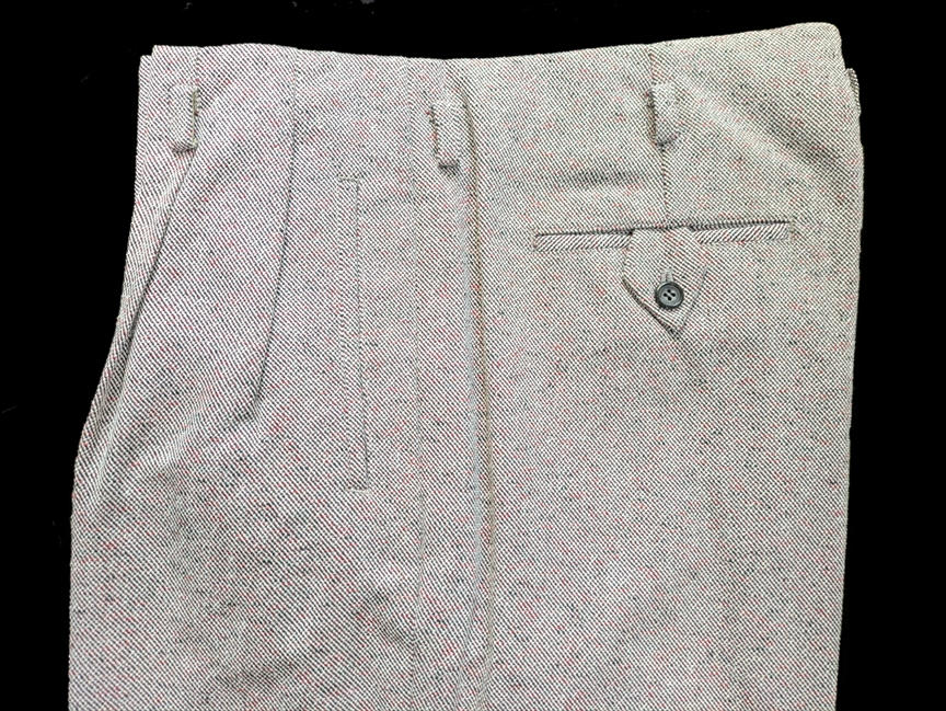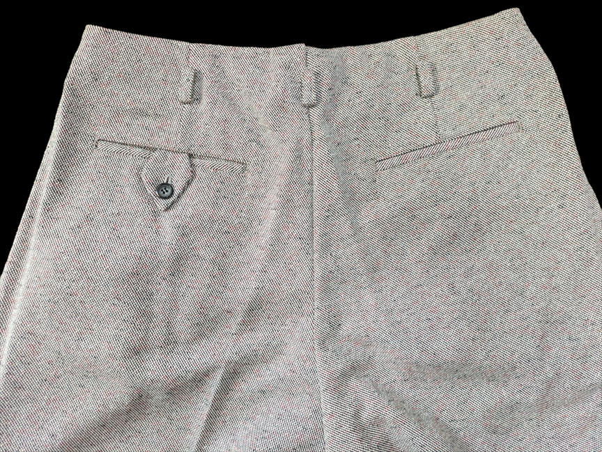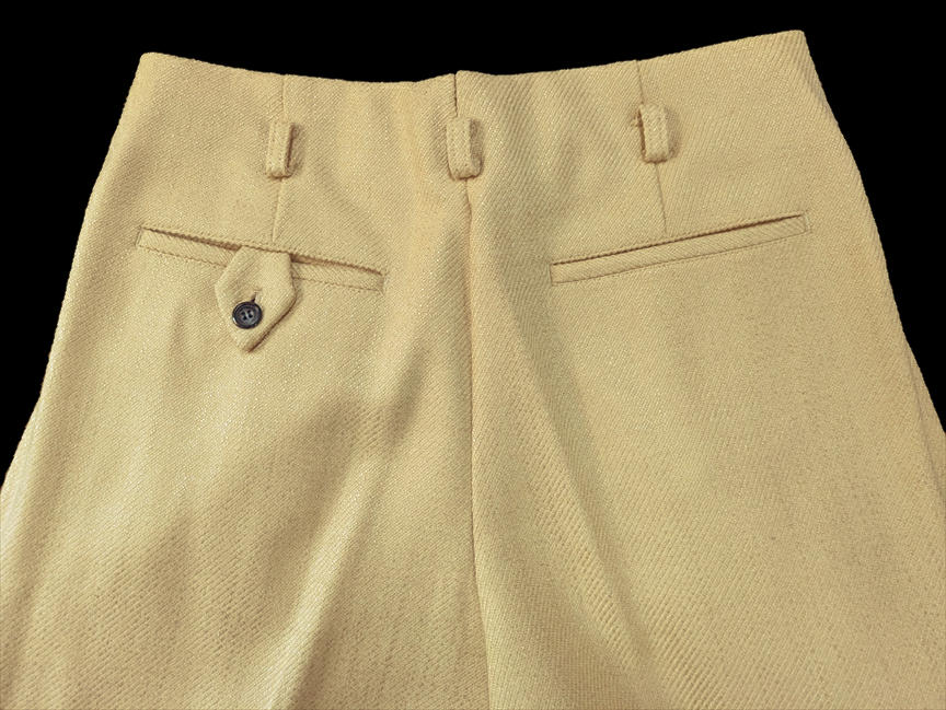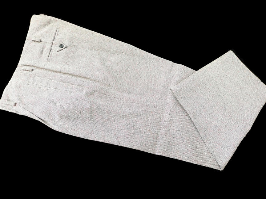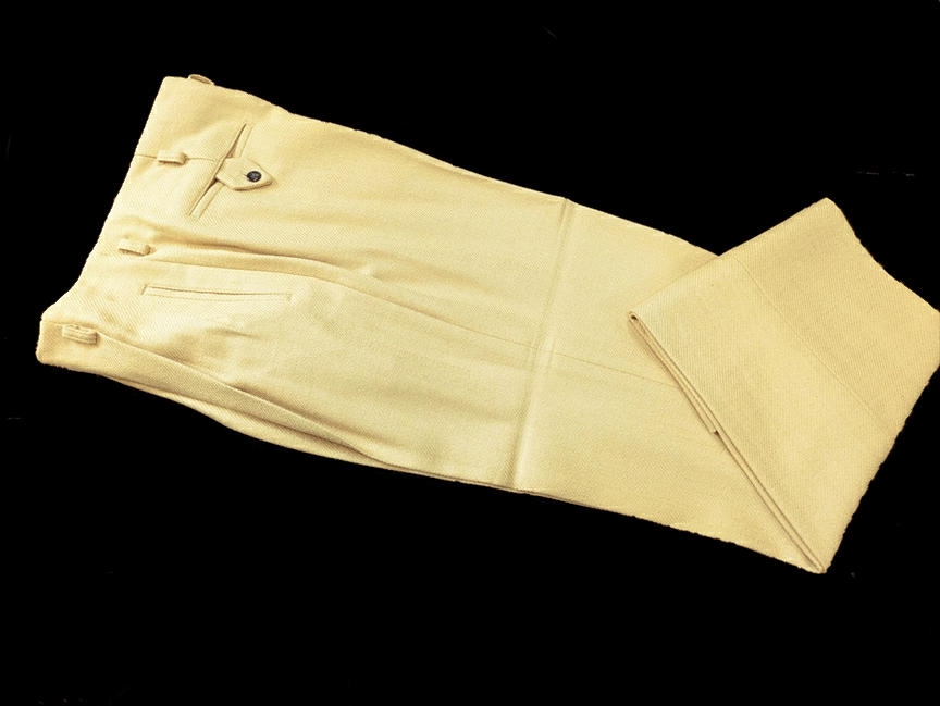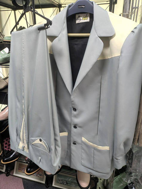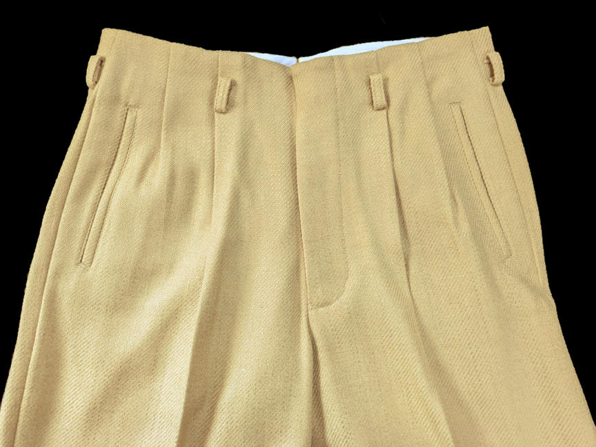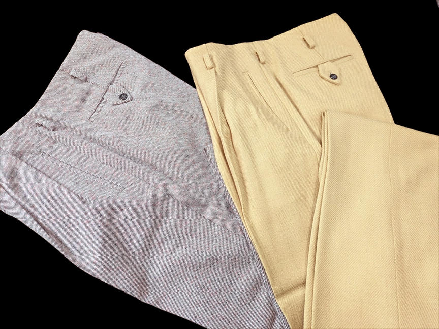 ではでは、七鉄登場20周年の2026年ご紹介第一弾アイテムは、クリーム系とライトグレーベースのロックンロール・パンツ2タイプじゃ。いずれも秋物/冬物の厚手のマテリアル。1955年に若きエルヴィスが果てしなき全米サーキットを繰り返していた頃、もっと厳密に言えば、大手レコード会社RCAの上層部が本格的にエルヴィスとの契約を検討し始めた、“黄金時代目前の頃”に着用していたパンツを想起させる、エレガントでエキセントリックなドレープ感がハンパないパンツじゃ。黄金時代の眩いファッションも勿論ええが、これから世界を突き上げるようなワイルドな勢いの頃のファッションもロックンロール・スピリッツの熱い原型が宿っておるようでVery Good !