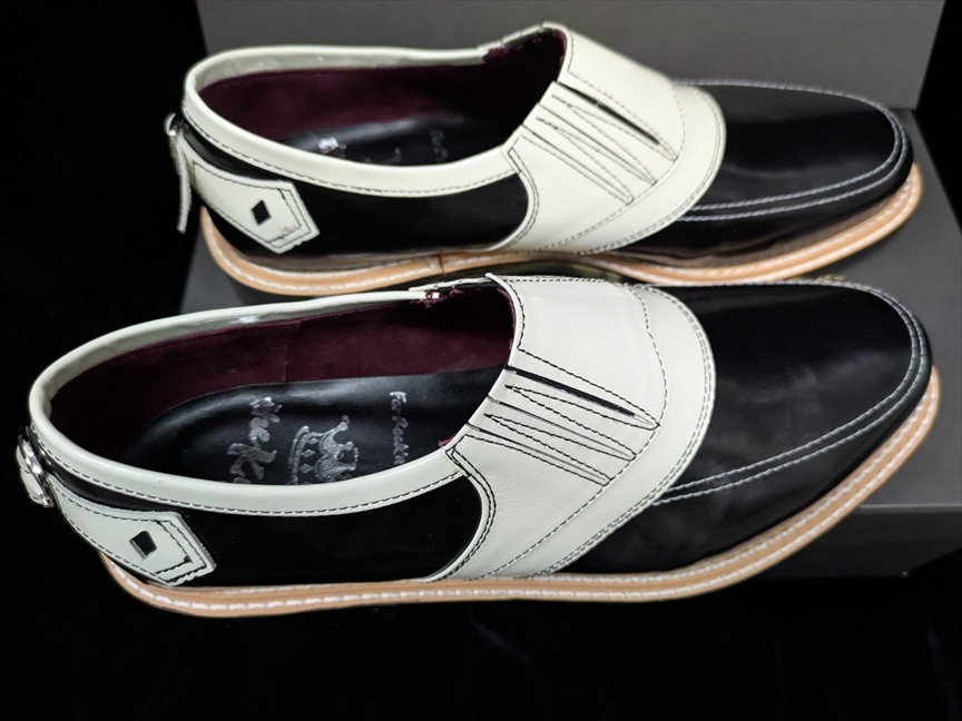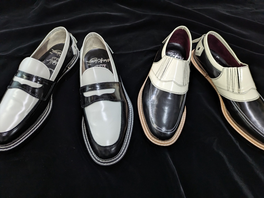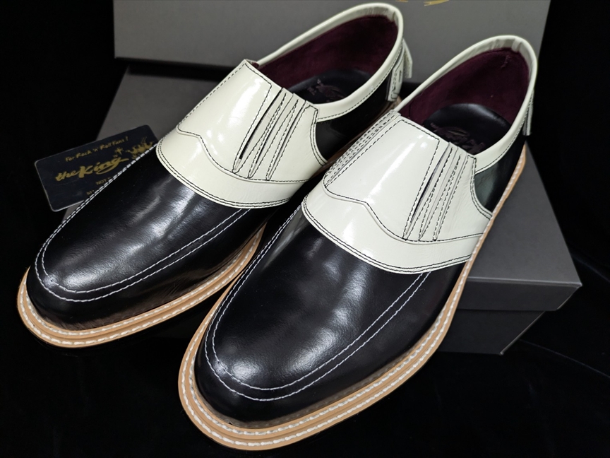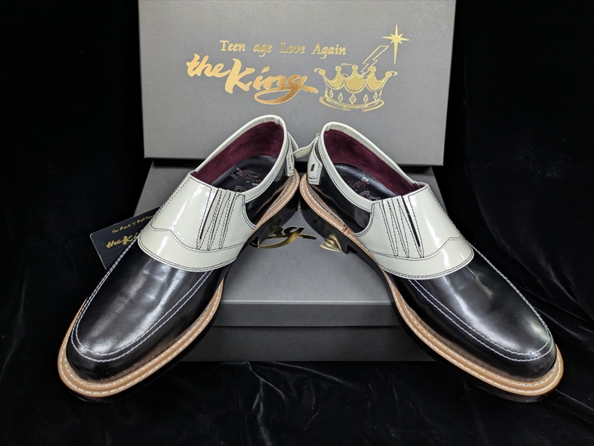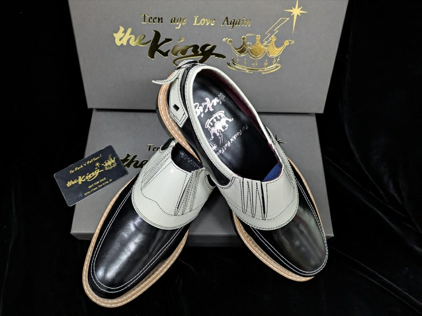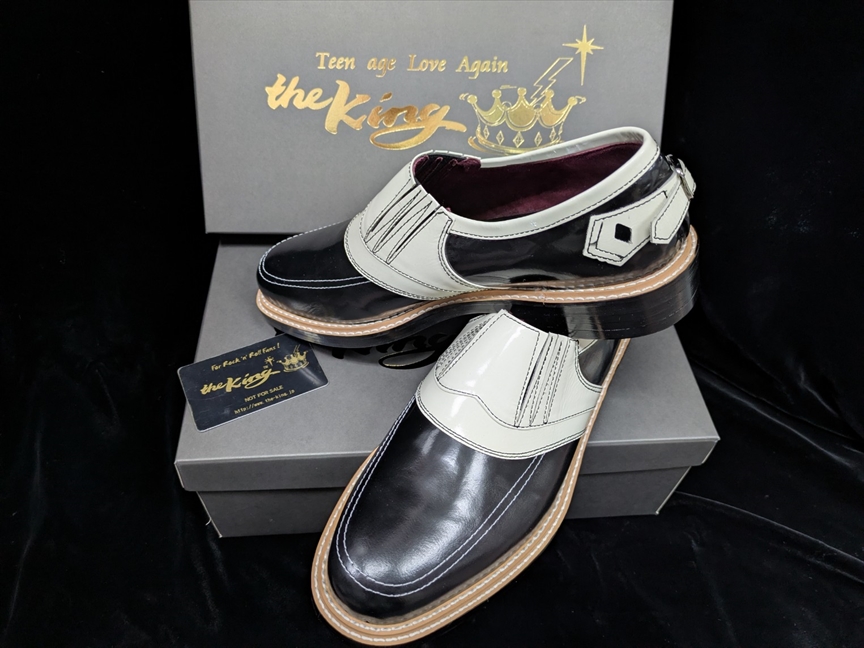 今回の新作はサイドゴア・タイプ。同タイプとしては2023年3月以来3年ぶりであり、ブラックの本体にホワイトのサイドゴア・パーツがドッキングしたロックンロール・シューズ王道のツートーンじゃ。The-Kingのロックンロールシューズは、そのモデルと完成度から発表毎に「ビンテージ」「クラッシック」等と伝統的重厚性を強調してきたが、輝かしい復活に際してはそうした形容はあえて外そう!もはや伝統的、王道的ロックンロール・フィーリングを超越した永続性/パーマネンシーなる表現で飾った方が相応しいじゃろうな!まさに「祝・ロックンロールシューズ復活」であ~る♪