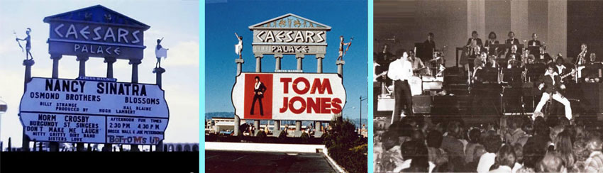 ![]() 昨年度(2024年)のネバダ州編にて、3回にわたってラスヴェガスのエルヴィスゆかりの地をしらみつぶしにご案内したはずじゃったが、事前調査の段階で一ヵ所重大な見落としがあった!調査隊のまめ鉄君を厳しくシメにゃならんな!(笑) エルヴィスは1970年8月6日、1974年9月3日の2回、ラスベガス最大のカジノ&ホテルであるシーザース・パレス(左写真)内にあった劇場サーカス・マキシマスにやって来ていたことがネット上にアップされておった! まず1970年8月6日は、この日フランク・シナトラ主催のシーザース・パレス開業4周年記念パーティーが催され、祝典演目としてシナトラの娘ナンシー・シナトラのショーが行われた。招待されたエルヴィスは正装姿でこの祝典にやってきた。(上写真3枚) ナンシー・シナトラのショーは途中からボーイズ・グループのオズモンズも出演し、ナンシーとともにほのぼのとしたショーを披露した。映画「スピードウェイ」(1968年公開)での共演でナンシーと意気投合したこともあって、エルヴィスは喜んでシーザーズ・パレスへ足を運んだと言われておる。残念ながらこの日のエルヴィスとナン シーの2ショットはネット上では見つからなかった。なお同様のヴェガス写真の中でエルヴィス、ナンシー、シナトラが談笑しておるが(右写真)、こちらは約1年前の1969年8月29日に行われたナンシー・シナトラ主賓のパーティーであり、会場はインターナショナル・ホテルであったのでお間違えの無いように。 次に1974年9月3日エルヴィス2度目のサーカス・マキシマスでの記録は、この日開催されたトム・ジョーンズのライブをエルヴィスが観に来た時じゃ。(下写真3枚)この時は当時のガール・フレンドの一人シェイラ・ライアン嬢を伴って現れた。 なお1968年6月18日には、フラミンゴ・ホテルでのトムのライブもエルヴィスは鑑賞しており、この時はバックステージでのトムとの写真が残されておる。(「バーチャル~ネバダ州2024年中編Area No.7参照」)