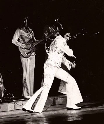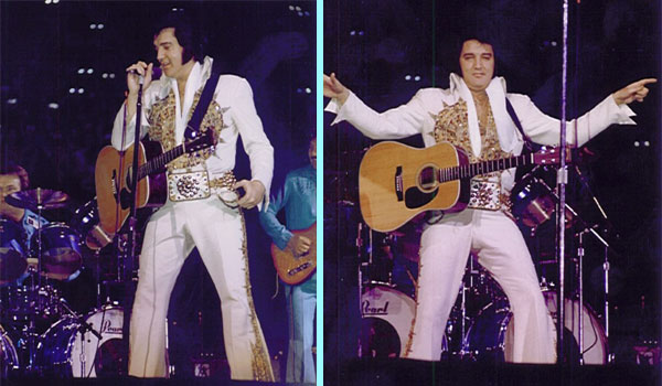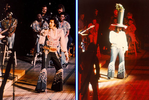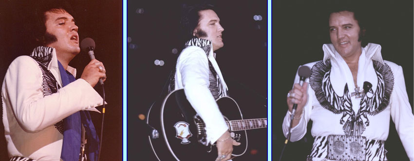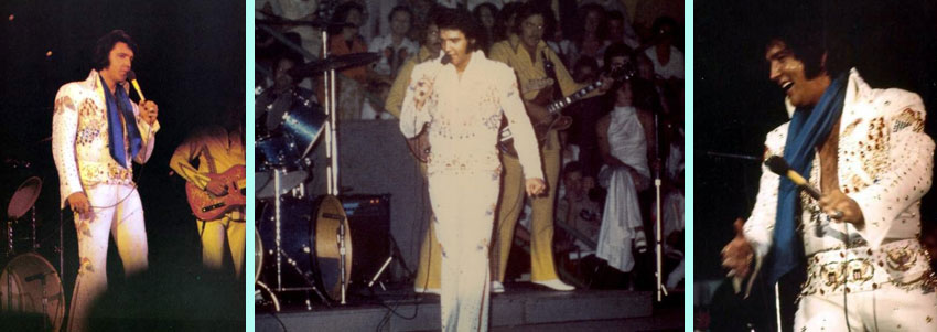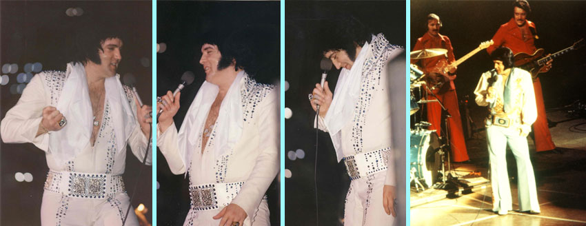 白亜の殿堂の“ホワイト・エルヴィス”![]() ![]() いきなり余談で恐縮じゃが、当時シンシナティに本拠地を置くメジャー・リーグ球団レッズが“ビッグ・レッド・マシン”と呼ばれて70年代最強時代を迎えており、1975年、1976年と連続してワールドシリーズを征しておる。(1978年に来日した時は巨人軍をコテンパにやっつけた!)シンシナティという都市全体がレッズの活躍により異常に盛り上がっていたのがこの頃じゃ。 そのレッズの本拠地球場がリバーフロント・スタジアムであり、エルヴィスはスタジアムにほぼ隣接して建てられていた屋内競技場リーバーフロント・コロシアムの方に出演した。こちらもホワイティーな美しい外観じゃ。(左写真) リバーフロント・スタジアム&コロシアムが建ち並ぶ光景を当時のシンシナティの人たちは「白亜の殿堂エリア」と呼んでおった。“リバーフロント(川の畔)”という名は、両会場の南側を流れるオハイオ川沿岸という意味合いから命名されたらしい。 コロシアムの外観を意識したわけではないじゃろうが、1976年のライブ(ナイトショー)ではエルヴィスは極力装飾が抑えられた純白のジャンプスーツで登場しておる。(下写真左から3枚。下写真右端はマチネーの別衣装)見方によっては、当時深刻な問題になりつつあった(?)エルヴィスの肥満状態がより目立ってしまうようなジャンプスーツでもあり、残されたライブ・レビューの冒頭も「エルヴィスはこれ以上太ってしまうと唇は顔から押し出されてしまうだろう」という懸念から始まっていた。外見の指摘は仕方がないとして、ライブの方は概ね好調であったようじゃ。