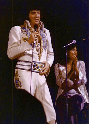 エルヴィスのライブ記録を追っておる方のために、一応説明しておくが、この3回のライブは多くの私設エルヴィス・サイトで「クリーブランドのクリーブランド・コロシアム」と記さ ![]() リッチフィールドとはエリー湖の湖畔、クリーブランドの中心地から30キロほど南下した地域であり、住所もクリーブランドではなくリッチフィールドじゃ。混乱されないようにな! 「バーチャル~」では、今まで何度もネット上で数多くある70年代のエルヴィスのライブ写真を転載してきたが、ライブ写真からはエルヴィスの好不調が判断しずらいことは既に諸君は理解されておることじゃろう。しかし上写真3枚の1975年7月10日のライブは、写真から連想出来るようにエルヴィスは絶好調だったようじゃ。ライブ・レビューは、まるで「75年最高のクオリティ・ライブ」の様な書かれ方をしておる!まあ御覧あれ!! 「伝説のエルヴィス・プレスリーは昨夜、リッチフィールド・コロシアムに集まった22,000人の熱狂的なファンを圧倒し、人生は本当に40歳から始まるのだということを見せつけた。少なくともエルヴィスにとってはそうだ。」 「確かに、彼の白いスパンコールの付いたジャンプスーツは、今ではサイズが2サイズほど大きくなっている。そして、彼の青黒い髪は少し薄くなり、彼の熱烈なファンでさえ、彼が以前ほど髪を揺らしていないことを認めるだろう。しかし、彼の声はかつてないほど良く響き、それが彼を20年以上にわたってロックンロールの王者にしたのだ。」 「エルヴィスは、ストーカー行為、からかい、おどけ、飛び跳ね、ギターをバトンのように振り回し、汗まみれのスカーフとおそらくもっと汗まみれのキスで女性たちを熱狂させた。しかし、ほとんどの観客は彼の歌を聴きに来ており、彼は彼らを失望させなかった。わずか1時間余りのステージで、彼は21曲を歌い、36枚のスカーフを配り、20人の女性にキスをした。」 「プレスリーの歌唱力は、50 年代に世界を震撼させたときよりも、今日の方がさらに驚異的だ!」 「ライブ終了後アナウンサーが『皆様、エルヴィスは会場を去りました』と言った。いや、エルヴィス・プレスリーのショーに勝るものはないだろうし、おそらく今後もないだろう!」