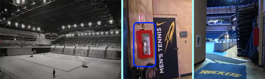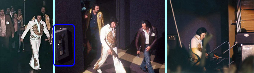 アメリカのマニアが撮影した現在のセンテニアル・ホールの動画がyou tubeにアップされており、その動画によるとこのホールはエルヴィスが出演した約40年前と基本的な構造がほとんど変化していないことが紹介されておるので、ほんの一部を動画の静止画で転載しておこう。 下写真左側は、エルヴィスが出演した当時のアリーナ席からのショット。(動画内に挿入されておった写真) 下写真中央がマニア撮影の動画(静止画)。上写真、下写真ともに青枠でくくった部分がエルヴィスが控室からアリーナスペースへ抜け出した出入口横の消火器。ケースの色は黒から赤に塗り替えられておるが、消火器のセット位置はまったく変わっていない。 下写真右側が、控室側から撮影された出入口を扉を開けた時のアリーナの現在の様子。右端に写る階段が、上写真右側でエルヴィスが昇っておる階段であり、ステージへと続く(仮設?)通路に繋がっていたのではないか、と撮影者のマニアさんは説明しておる(ようじゃ)。ライブ情報が無い中で、せめてもの有難い会場情報として転載させて頂こう。