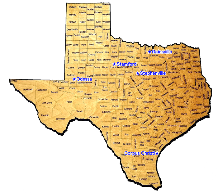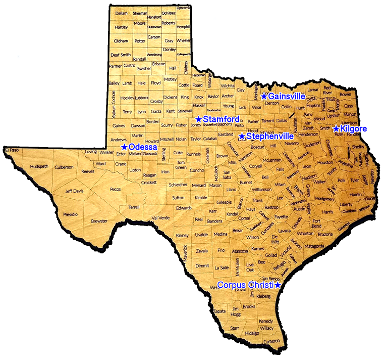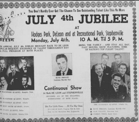 ステーブンビルのシティ・レクリエーション・ホール(左写真下段)でのスタート時間は午前10時とされておるので、エルヴィス一行は前夜のうちにコーパス・クリステーを出発しておるはずじゃ!ルイジアナ州シュリーブポートを発った前々日の夜から約1日半の間に約1,200キロの移動をこなしながらの超ハードスケジュール! ステーブンビルからデ・レオン経由のブラウンウッドビルまでは約90キロの距離なのでこの移動はさほど大変ではなさそうじゃが、とにかくエルヴィスご一行様、大変にお疲れ様でございましたとしか言いようがない!(※デ・レオンのライブは「バーチャル~テキサス州2024年中編 Area No.55」、ブラウンウッドビルは「テキサス州2024年補遺編 Area No.69」でご案内済じゃ。) このトリプル・ヘッダー・ライブに関しては詳しい資料はネット上には少ないので、当日の状況は全て憶測の域を出ないが、気になるのはハードスケジュールの中でのエルヴィスの体調じゃ。トリプルヘッダー・ライブの真ん中、デ・レオンでのエルヴィスの様子をとらえた写真は存在するので、「バーチャル~」では再掲載じゃが今一度確認してみてくれ~。(下写真3枚)