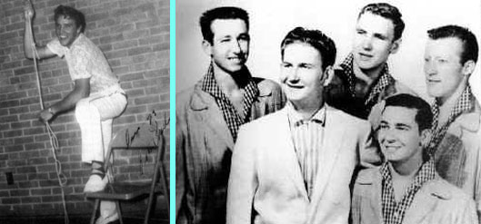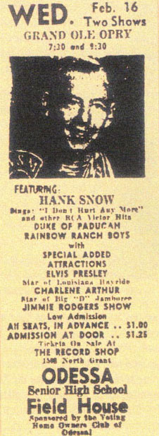テキサス州の西側、ニューメキシコ州との国境近くの街オデッサにおいて、エルヴィスはハンク・スノウ音楽一座の一員として4回(もしくは5回)ライブを行っておる。うち3回(もしくは4回)はオデッサ・シニア・ハイスクール・フィールドハウスが会場じゃった。「バーチャル~テキサス州2024年後編」において“オデッサ・ハイスクール~”としてご案内済じゃが、当時は「ハイスクールとシニア・ハイスクールが同一なのか否か」がいまひとつ解明出来ておらんかったが、この度の再調査で同一であることが分かり(シニア・ハイスクールが正式名称)、また少々あらたな付属資料と写真が見つかったので再掲載、再案内するぞ。この会場におけるエルヴィスのライブは、最初は1955年1月4日という説が存在するが、この日はSMWでは不確実情報とされており、EDDには記載無し。事実を証明する証拠資料が未だ発見されていない。その後、1955年2月16日、5月31日、10月14日には確かに行われた。5月31日は隣町ミッドランドと併せて夜2回のライブじゃ。(左写真は2月16日の新聞広告) ライブ写真はネット上には未だに無いが、新しいテキストデータとしては、まず当時オデッサの大学に通学しながらシンガーとしてのデビューを目論んでおったロイ・オービソンがエルヴィスのライブを見た時の証言が短いながらも見つかった。(2024年度編の調査では、わしが見落としていただけだったようじゃ。失礼した!)「エルヴィスのシンガーとしての本能的なエネルギーは衝撃的だった」 この情報に関しては掲載サイトによってライブの日付が異なっており、オービソン・マニアによると「ロイはオデッサの前にもエルヴィスを見ているはずだ!」とのこと。 またEDDによると、1955年2月16日のライブはルイジアナ・ヘイライド出演時のサポートメンバーであるフロイド・クレイマー(ピアニスト)が参加しており、観客数は約850人。一部の資料では4,000人という記録も残されておるが、4,000人という数字はちょっと怪しいかも!?右写真は1940年代のオデッサ・シニア・ハイスクールのイヤーブック(卒業アルバム)内の学内写真。どの建物がフィールドハウスに該当するのかは不明。 右写真左側は、1955年5月31日のダブル・ライブ、午後7時半スタートのミッドランドでのエルヴィス。その後ハンク・スノウ一座とともにエルヴィスはオデッサに移動した。右写真右側は、ロイ・オービソンがエルヴィスのライブを見た1955年に結成したボーカル・グループ、ティーン・キングス。 既にオデッサのTV番組に出演するようになっていたロイ・オービソンは、亡くなる前に「テレビ出演の際にエルヴィスと共演したことがある」と語ったとされておるが、エルヴィス・マニア側からの見解によると、「エルヴィス単独、およびブルームーンボーイズがロイ・オービソンと一緒にテレビ出演したことはない」としておる。スコッティ・ムーアも生前にこの噂に関しては否定しておったことがSMWに記載されておる。