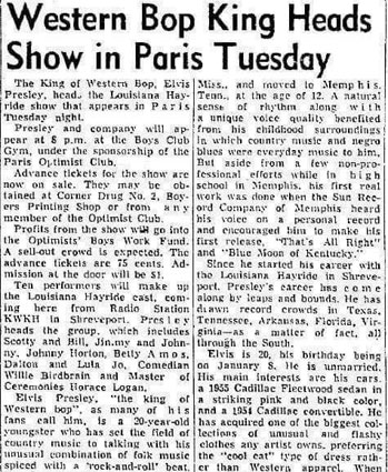 テキサスの中の小さなパリで、若きエルヴィスは女の子たちとエンジョイ! 1955年10月4日にエルヴィスがライブを行った街がテキサス州パリスはテキサス州北東部の北側オクラホマ州との州境まで40キロの位置にある。アメリカ映画マニアの方なら、ライ・クーダーが音楽を担当した「パリ・テキサス」という傑作ロードムービーを想起されるかもしれんが、パリスと映画の内容とはほとんど何の関係もない。(主人公がパリス出身という設定ぐらいか。)パリス・ボーイズ・クラブ・ジムナジウム(左写真)でのライブ記録は近年まで何もネット上にアップされておらんかったが、2019年になってパリス発信のローカルサイトに「エルヴィス・イン・パリ:ロックンロールのキングがパリで演奏してから64年」というコラムが掲載され、ライブ会場で座席設置のお手伝いをしたご褒美としてライブを最前列で観ることが出来た当時8歳の少女をはじめとした複数の目撃者の証言が紹介された。その一部を転載しよう。 「パリスに来た時エルヴィスは若かったし、自分は特別な人物だと思っていたみたいだったわ。パリスの住人みんなが会場に集まっているようだったわ。」 「観客席はあっという間に十代の若者でいっぱいになり、ホールの隅々まで椅子が置かれていた」 「エルヴィスは派手な服を着ていました。私たちは彼を直接見ることができて楽しかったですし、もちろん、その後彼はもっと有名になりました」 「エルヴィスはとにかくよく動き回っていた!」 とまあ、特筆すべき出来事は語られていなかったが、「エルヴィス・イン・テキサス」という書籍の中には別の証言が掲載されておることもコラムの中に記載されておった。それはライブが終わると、エルヴィスは群がったファンたちに1ドルでサインをしまくったり、数人の女の子をピンクのキャデラックに乗せて街を周回して再び会場に戻ってきたりしていたそうな!また最後はビルとともに、近くを流れるレッド川の向こう側にあるモーズリーズというビアホールへ向けてキャデラックで走り去ったとか。(スコッティは?)一方では3人の女の子を乗せて走り去ったという証言もあるらしい! 右写真はライブ前に新聞に掲載された告知コラム。エルヴィスをまだ“Bob King”と形容しておるタイトルがおもしろい! パリスという名前や街中にエッフェル塔のレプリカが建てられておることから(下写真左側)、パリスはフランスのパリと何か因縁でもありそうな街じゃが、wikipediaには何も触れられておらん。フランスからの入植者たち、もしくはちょっと特異な白人至上主義者たちが作った街なのか。 この街は元々人種差別の激しい場所であったようで、wikipediaにはその点について詳しい記述があった。かなり血生臭い残酷な差別事件の歴史もあり、エルヴィスが事前に知っていたらライブは行われなかったのでは?と思われるほどゾッとしたわい。 また下写真左側地図で御覧の通り、大通りが街の中心を一周しており、これは本場パリ仕様じゃ。エルヴィスが女の子たちを乗せてキャデラックで周回したのはこの環状線かもしれない!