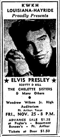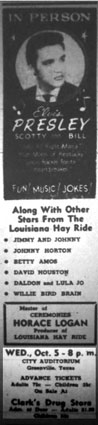 上記パリスでのライブの翌日、1955年10月5日エルヴィスはパリスの南西40キロにあるグリーンビルに移動してライブを開催。左写真左側は新聞広告、左写真中央はこの度のネット調査でわしが初めてお目にかかったグリーンビル・シティ・オーディトリアム(バックステージ?)での撮影とされるショットじゃ。この写真はPinterestにアップされたもので、データは日付と撮影場所だけ。本当にデータ通りの写真なのか?とりあえず、エルヴィスのパーマがかかった(様な)クルクル・ヘアーを判断基準として、1955年10月5日前後のライブショットと参照。直近で9月26日テキサス州ギルマーと10月6日テキサス州オースチンでのライブ写真があり、いずれもエルヴィスのヘアスタイルはカールがかかっておったので、この写真はグリーンビルでの撮影の可能性ありとしておくぞ。 この時期のエルヴィスはRCAとの大型契約間近であり、単独ライブも増えて来たものの、まだミュージック・ジャンボリーの一員としての出演もあった。グリーンビルでのミュージック・ジャンボリーはルイジアナ・ヘイライドのスターたちとの一座であり、グリーンビルには「ルイジアナ・ヘイライド・ジャンボリー・ツアー・オブ・テキサス」の一貫としてやって来た。ライブに関する情報はまったくみつからなかったので悪しからず。 2005年10月31日に「エルヴィス・グリーンビル・ライブ50周年記念イベント」が同会場で行われ、多数のエルヴィス・インパーソネータが集まったことが地元サイトに記載されておった。(写真左側は50周年イベント用ポスター) ン当初とはかなり変わったものの、ミュニシパル・オーディトリアムと改称されて現在でも稼働中。ロビーにはデューク・エリントンやロレッタ・リンら歴代の出演アーティストたちのコラージュや、エルヴィスの出演ポスターのコピーが綺麗にディスプレイされておるそうじゃ。上写真右側ストリートビュー2022年6月撮影。 |