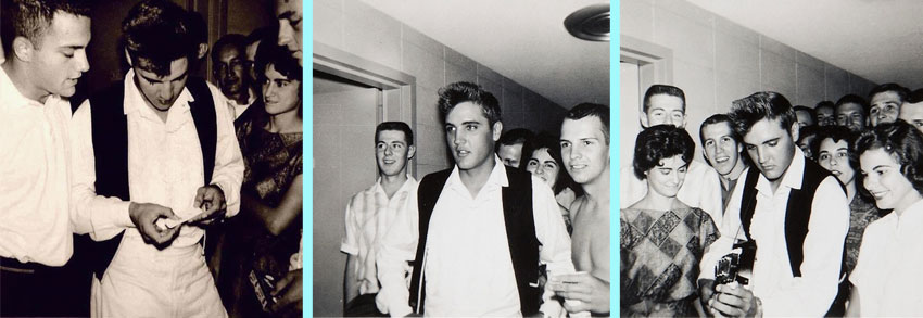 こちらのエルヴィスのイケメン写真は、1958年8月9日、軍役中の休暇日に訪れたユーレスという地域にあった高級モーテル、ウエスタン・ヒルズ・インで撮影されたものじゃ。ユーレスは当時エルヴィスがレンタルしていた家のあるキーリンから車で2時間半ほどの場所であり、街はずれにあったこのモーテルでエルヴィスは休暇を過ごすことが度々あったそうじゃ。 この日はテキサス・クリスチャン大学の学生パーティーがモーテルで開かれており、たまたま滞在していたエルヴィスに会えた学生たちは大喜び!エルヴィスもご機嫌でギターを弾いてみせたりしたという。(上写真右側は、ギターのチューニングをするエルヴィス) 当時エルヴィスは23歳。そして写真に写り込んでおる学生君みんなもエルヴィスとほぼ同年齢。エルヴィスと学生君たちが学友みたいにも見えて微笑ましいですな。でもこう言っちゃ~なんじゃが、エルヴィスだけ別人種に見えるほど圧倒的にイケメンじゃな!(今更ジローじゃけど~笑) また女学生ちゃんたちは、ライブで絶叫しておる女の子たちよりはオネーサンじゃが、希代のスーパースターの傍で輝くような表情をしてますな!