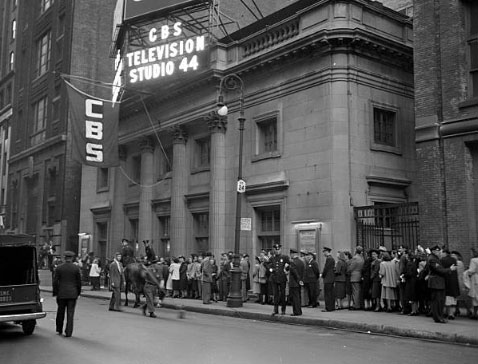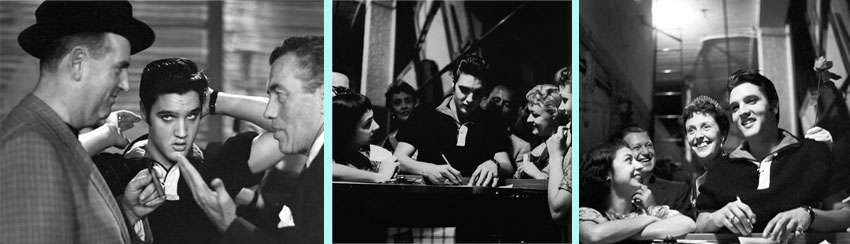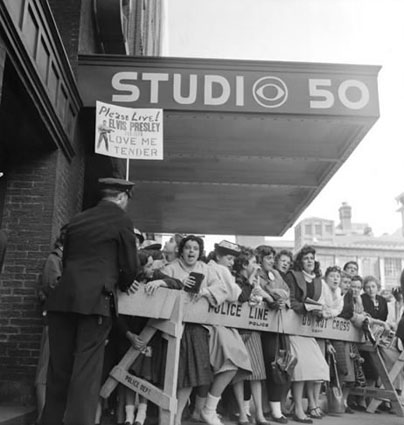 LINE」と表記されたバリケードも写っておる。これはリハはスタジオ50の方だったことの証拠写真かもしれない。ちなみに上写真中央、右側でエルビスの背後に写っておるチョイ年配のオバサマは当日招待されたイギリスの女性コメディアンとか。彼女の伝記の中にこの時の場所は「CBSスタジオ」としか記されておらんようじゃ。 なお実に紛らわしいが、マキシン・エリオット・シアターは「スタジオ44」の他に、「マキシン・エリオット・シアターのスタジオ51」という別称もあるようなので、諸君が個人的にお調べになる場合は混同しないように。 |