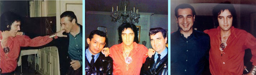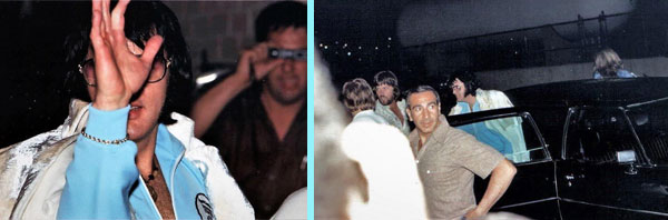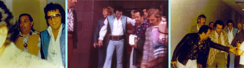 下写真左側は、74年6月28日、マチネーを終えて一旦ヒルトン・インへ戻ってきた際のエルヴィス。 下写真中央、右側は76年6月28日フィラデルフィアのエルヴィスとされる写真。(撮影場所のデータ無し)エルヴィスが水色のジャージの上に白いコート(?)を羽織っておる珍しい写真じゃ。ライブ会場(スペクトラム・アリーナ)かホテルか、どちらの駐車場なのか識別が難しいが、恐らくジャージ姿、周囲にメンフィスマフィア以外の人物がいる状況等から、ナイトショー終了後にヒルトン・インに戻ってきた時の撮影と思われる。ジャージ姿ではライブ会場に乗り込まないはずじゃ!