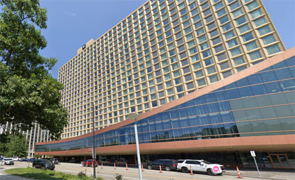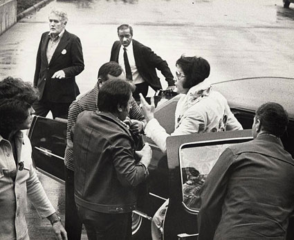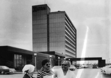 ![]() “悪夢”のベルビュー・ストラッドフォード・ホテル(上記Area No.4参照)ではなくて、1976年6月28日のフィラデルフィア・ライブの際に利用されたホテルが、こちらヒルトン・インじゃ。(左写真) このホテルでのエルヴィスの様子が撮られた写真は1974年6月23日の宿泊時(および翌24日)の隠し撮り写真が多い。露出度は上カラー写真3枚よりも、むしろ下写真3枚が高いだろう。「バーチャル~ペンシルベニア州2023年編Area No.2 フィラデルフィア国際空港」で掲載済の、6月29日にホテルをチェックアウトして車に乗り込む際の写真じゃ。 エルヴィスは左手にファンから差し出された好物のピーナッツ・バターのカップを持っておるのが特徴的なショット(赤丸部分)じゃ。左写真のホテル右側の長く突き出した庇部分が、下写真でエルヴィスが写されておる場所じゃ。(下写真右側だけは、空港で撮影された可能性あり)