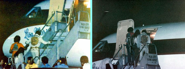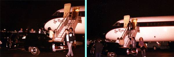 エルヴィスの背中が小さく見える・・・。 上記エグゼクティブ・インとフリーダム・ホールの追加情報にて「1977年5月21日のエルヴィス」をご紹介したが、当日2度利用した国際空港でのショットも併せて掲載しておこう。左写真上段2枚が当日未明(日付が5月21日になった後)に空港に到着してリサ・マリー号から降機した時の撮影。この後車に乗り込んで上記エグゼクティブ・インへ移動する。 左写真下段2枚は当日のライブ終 了後に空港に直行し、次のライブ地であるメリーランド州ランドオーバーへ移動するためにリサ・マリー号に乗り込む際の撮影。1日で二度、しかもいずれも夜間に空港で撮影された珍しい(かもしれない)4枚の写真じゃ。 すべての写真は望遠レンズで(?)かろうじてエルヴィスの姿を捉えておるものの、たとえ遠目の写真でも 以前のエルヴィスなら存在感抜群ではっきりと認識出来たが、この4枚のエルヴィスは生気が無くて消え行ってしまいそう・・・。(夜間撮影であることも関係しておるのかもしれないが)ホテルでゆっくりと宿泊も出来ずに、リサ・マリー号で同日に到着/出発をしておるなんて、ホント亡くなる直前までエルヴィスは働きづめだったんじゃなあ~と胸が苦しくなってくる写真じゃ。 |