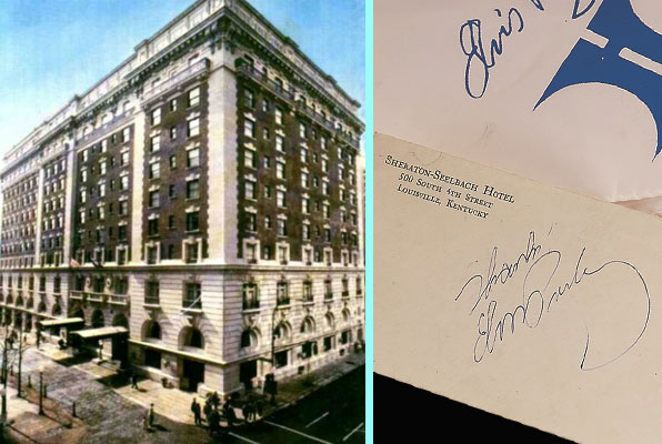 ケンタッキー州でのエルヴィスのライブは50年代に2回、70年代に4回、すべて同州でもっとも人口の多い街ルイビルで行われておる。ライブ会場は、55年12月8日リアルト・シアター、56年11月25日ルイビル・アーモリー、70年代はすべてフリーダム・ホールであり、これらすべて「バーチャル~ケンタッキー州2022年編」でご案内済じゃ。56年11月25日のライブの際は、ルイビル老舗の大型ホテル、シールバック・ホテルにエルヴィスは宿泊した。(左写真左側)シールバック・ホテルを調べてみると、50年代にエルヴィスが全米各地で宿泊した各都市で指折りの格式のあるホテルの中でも特に名高い豪華ホテルだったようじゃ。 外観は他の都市の大型ホテルと変わらないようじゃが、調度品の数々が抜きん出て素晴しく、歴代の大統領をはじめとして、銀幕のスターたちや様々な業界の著名人が続々とシールバック・ホテルを訪れた歴史を誇り、アメリカ文学史上に燦然と輝 くスコット・F・フィッツジェラルドも常連じゃった。ジェラルドの代表作「ザ・グレイト・ギャッツビー」の中に登場するホテルはシールバック・ホテルがモデルという説が未だに強い!またジェラルドは、禁酒法が執行されておる時代に高級ウィスキーと葉巻をシールバック・ホテルで密かに嗜んでいて、ある時その度が過ぎてホテルから摘まみ出されたというエピソードもある(笑) Wikipediaには次のような書き込みがあり、シールバック・ホテルの繁栄そのものがルイビルの発展に大いに貢献していたことが分かる。 「建設当時、4番街とウォルナット通りの周辺には他にほとんど何もなかった。ホテル建設計画が提案されたとき、ルイビル市長は“こんなに遠くにあるホテルには誰も来ないだろう”と言った。ルイビルの中心から遠く離れた土地にホテルを建てることを思いとどまらせようとする者も何人かいた。しかしホテル開業以来、ルイビルも拡大し、シールバック・ホテルは長い間、市内の活気あるショッピングとビジネス地区の1つにまたがってきた。1930年代から1960年代にかけて、シールバッハ・ホテルはルイビルの最高のショップが集まるエリアの中心地になった。」 SMWの中では、エルヴィスの到着直後から女の子たちが大勢ホテル内でエルヴィスを探し回っていたことが記されておる。またシールバック・ホテル内でのエルヴィスの写真は残されておらんが、ホテル専用の便箋に記されたエルヴィス直筆のサインが海外のオークションで出品された記録がネット上で発見できた。(上写真右側。写真内上側の白い布は、同時出品されたラスベガス・ヒルトン・ホテルでのライブでファンがゲットしたスカーフ)左上写真はシールバック・ホテルにエルヴィスが宿泊した同日のライブ写真。 ![]() 右写真左側は、ホテル発信のインスタグラムの中に掲載されていたプロモ・リフレットの写真。これまで宿泊した有名ミュージシャンの名前や写真があしらわれておるが、エルヴィスは何故か名前のみで残念(笑)右写真右側はストリートビュー2024年6月撮影。往年の荘厳な佇まいは見事に残されておる。 |