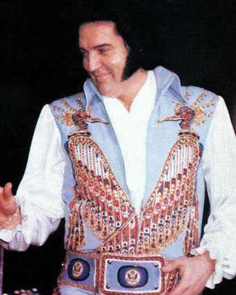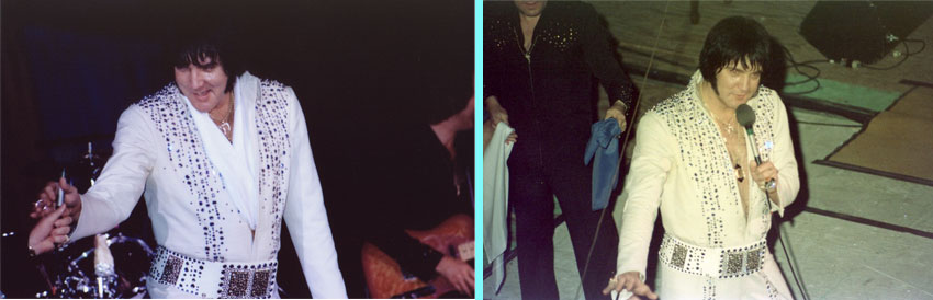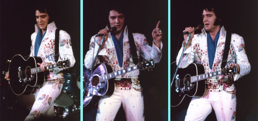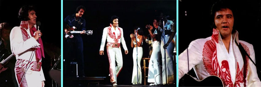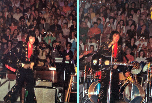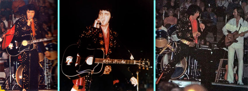 またこのツアーの特徴は、エルヴィスのブラックのジャンプスーツ(通称ブラック・ピンホイール)の着用頻度が高いことじゃ。タスカルーサを含めて11都市中5都市で着用されておる、わしはジャンプスーツ・マニアではないので、正直なところブラック・ジャンプスーツを見ただけではどこの会場のライブであるのか判別は出来ない。上写真3枚と右写真2枚は、ネット上のライブ写真掲載においてわしが信頼を寄せておるEPC提供によるものじゃ。ブラック・ジャンプスーツは、着用しておるエルヴィス本体だけを見た場合は大変に見栄えが良く、スリムでキレッキレだったエルヴィスの身体的な魅力を引き立たせておる。しかし当時はファンにもマスコミにもあまり評判が良くなかったらしい。 ブラック・ジャンプスーツはスポットライトの当たり方によっては背景の暗がりとエルヴィスが一体化してしまい、エルヴィスのアクションが分かりづらいからとか!言われてみればワカランこともないし、ステージ・アクションを観るだけでもチケット代以上の価値のあるエルヴィスならではの仕方のない批判じゃな(笑)71年11月のツアー以降はブラック・ジャンプスーツはほとんど着用されておらんので、どうぞじっくりと!(笑) 現在ネット上で読める71年のライブ・レビューによれば、総括すると“エルヴィス、それ以上に観客が絶好調だった!”といった具合じゃ(笑) 「エルヴィスはシンガーというよりアクロバット・ダンサーであり、ファンはそれに酔いしれている」 「エルヴィスはハンドマイクなど必要のない数少ないシンガーである」 このような描写が、この日エルヴィスがステージ上でかなりアグレッシブなアクションを披露していたことが窺い知れる!またライブ中に「私が歌える400曲の内、今夜は320曲を歌うよ!」と語って16,000人を越える大観衆から喝采を浴びたという!ラスベガス地獄からひととき抜け出した“ブラック・エルヴィス”はツアーを心から楽しんでいたに違いない!