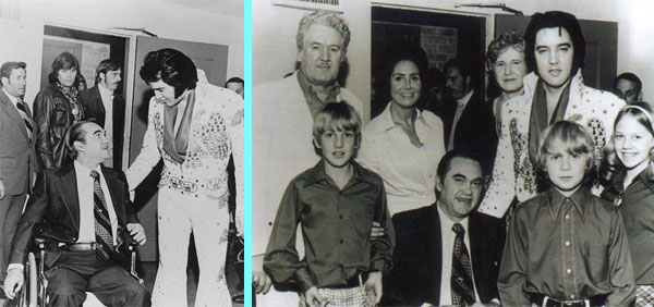 No.6参照)このステイト・コロシアムは70年代にガレット・コロシアムと改称されており、改称後に二度エルヴィスはライブを行っておる。「バーチャル~アラバマ州2022年編」の調査段階でこの点を見落としておったので、この度あらためてご案内しよう。 1974年3月6日に約19年ぶりにエルヴィスはガレット・コロシアムに登場した。(上写真3枚)この日アラバマ州知事ジョージ・C・ウォレス氏と彼の家族はエルヴィスにバックステージへ招き入れられておる。知事夫妻は前夜「エルヴィスをリラックスさせたかった」という意向で会見を申出たそうじゃがエルヴィス側の都合で会見は実現せず、その代わりにガレット・コロシアムでのライブ前にエルヴィスは知事のファミリーをバックステージへ招待した。(右下写真) 実はエルヴィスはウォレス知事の支持者であったとされており、知事が1972年に大統領選挙に出馬し、予備 選挙活動の最中に反対派から銃撃を受けて重症をおった際、「犯人を見つけ出して射殺してやる!」とマスコミに公言したことがあった。エルヴィスのこの発言に対して知事は「そんなことをしたら彼は犯罪者になってしまい、多くの人たちが悲しむことになる」とのコメントを返している。以降知事は「エルヴィスの音楽はよく分からないが、私や妻を含めて家族はみんなエルヴィスのファンである」と強調していたらしい。(パーカー大佐もまた知事を支持していたともいわれる) 知事と家族はエルヴィスと会見した後にステージから7列目の座席でライブを鑑賞。この日会場には16,400人もの大観衆が詰めかけており、凄まじい女性客の絶叫が続く中でのライブに知事は終始唖然としておったらしい。「さしもの知事も、この日ばかりは誰も自分を気にも止めず、自分が主役ではないことを悟ったであろう」という当時のジョーク記事がネットにアップされておる(笑) ガレット・コロシアムにおける70年代のエルヴィス再登場は1977年2月6日。この日エルヴィスは好調ではなかったようじゃが、“特別な出し物でモンゴメリーの観客をもてなした”とされておる。“最初で最後”との記録が残っておる、ゴスペル曲「ホエア・ノー・ワン・スタンド・アローン」を歌ったのじゃ。短いライブレビューに おいて、次の様に書かれておる。「ホエア・ノー・ワン・スタンド・アローン」は明らかにリハーサルはされておらず、あまりうまくまとまっていなったが、それでも美しい!エルヴィスが「ホエア・ノー・ワン・スタンド・アローン」を歌う前に、観客の誰かがエルヴィスに女性用の服を手渡した。エルヴィスはそれをバッグシンガーのキャシー・ウェストモーランドに渡し、“これは君のために特注したんだ!”とジョークを飛ばした。キャシーにそれを試着させるまでした! 右写真ストリートビュー2023年4月撮影。下写真は77年のライブ撮影。 【余談】 エルヴィスがジョージ・C・ウォレス知事の支持者だったという定説の真相は不明じゃ。知事の略歴をチェックしてみたが、若い頃から有名な人種差別主義者であり、アメリカ南部でのあらゆる人種隔離制度廃止運動にも一貫して異を唱えておった形跡がある。子供の頃から音楽を介して黒人たちと交流していたエルヴィスが知事の政治的姿勢に賛同するとは考えにくい。 恐らくエルヴィスはイデオロギー的に知事を支持していたのではなく、知事が被った銃撃事件に対しての純然たる憤りを表明していたに過ぎず、またエルヴィスも知事と同じ南部出身者だったことも含めてマスコミに曲解、拡大解釈されていたのではないだろうか?