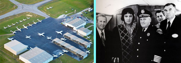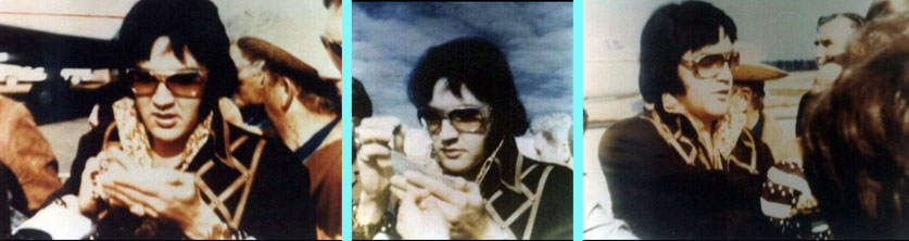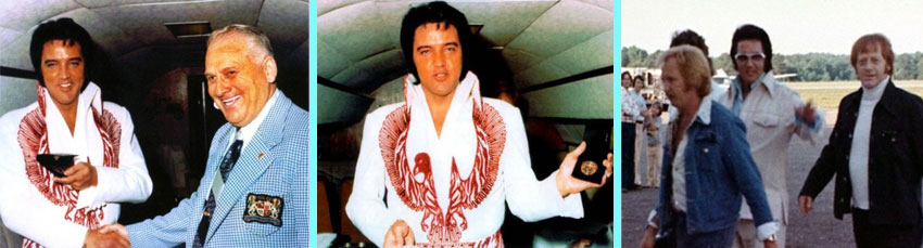 タスカル―サはアラバマ州の州都モンゴメリーの北西約150キロの位置ある人口10万クラスの中規模都市じゃ。“タスカルーサ”とは“助かるさ”みたいで(失礼!)英語名っぽくないが、16世紀当地で名を馳せた現地民族のインディアン酋長のお名前らしい。 70年代にエルヴィスはタスカルーサで3度ライブを行っており、上写真3枚は1971年11月14日に初めて当地を訪れたローカル空港での撮影。この時期はまだ空港でのファンの歓迎やマスコミの取材にパーカー大佐は寛容だったようで、他にもエルヴィスが空港に集まったファンにサインをしておる写真がネット上で確認出来る! ![]() 左写真右側は、エルヴィス初のタスカルーサ来訪を歓迎して、空港に着陸したプライベートジェットの機内までエルヴィスを訪問した当地の警察署長ウィリアム・マラブル氏との記念撮影。 エルヴィスは午後2時半からのライブが終了した後、警察署主催の晩餐会に招待されて“タスカルーサ名誉警察官”に任命されたという情報もある。晩餐会の場所は諸説あり、「タスカルーサ・カントリー・クラブ」という高級ゴルフクラブ内のラウンジという説が強い。 また下写真左側、中央(カラー写真2枚)は、1975年6月3日のライブの際にやはりエルヴィスを機内まで出向いて迎えた警察署長とのショット。このショットには警察署長さんの氏名がクレジットされておらんが、71年11月14日に出迎えたウィリアム・マラブル氏と同一人物であると思われる。エルヴィスが手にしておるのはこの時に授与された警察署長バッヂじゃ。 1975年6月3日の空港での写真は、エルヴィスが滑走路に降り立った写真もある。(下写真右側)解せないのは、私服で降機しておるのに、機内写真は何故ジャンプスーツ姿なのか?一旦降機した後に機内へ戻り、ジャンプスーツに着替えてから警察署長さんからバッヂを授与されたということか?(その間、地元のホテルにチェックインはしていないのか?)まあ、エルヴィスの表情も健康的であり、この後良いライブが展開されることを予見出来るようなショットだから、これ以上小姑紛いの詮索は止めておこう(笑)