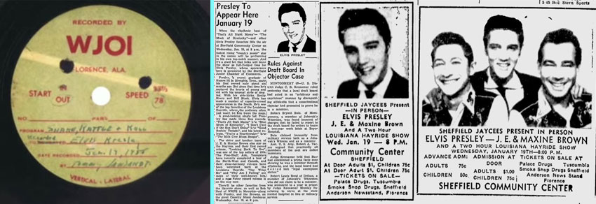 1954年夏、サンレコードから公式デビューを果たしたから約半年後、エルヴィス&ブルームーン・ボーイズは1955年1月9日アラバマ州シェフィールドのコミュニティー・センターでライブを行った。(「バーチャル~アラバマ州2022年編」Area No.1参照)ライブ開始は午後8時半であり、同日の昼間に地元のラジオ局WJOIにて番組出演をし、ラジオ局内のスタジオで「シェイク・ラトル・アンド・ロール」のデモテイクを収録した。(下写真左側は、レコーディングされた同曲のアセテート盤) WJOIについては「アラバマ州2022年編~アウトテイク集でご紹介しておるが、2022年時点ではWJOIの詳細が不明であり、簡単な解説のみ記載したが、2024年後半になって当時WJOIの16歳のプロデューサーだったトミー・バン・サントのインタビューがネット上で散見出来るようになり、新たな証言を読むことが出来るようになった!トミー氏はラジオ局のオーナーの子息でもある。 2024年のインタビュー当時、トミー氏は実に85歳!しかし70年前の記憶がはっきりしていて驚くばかりじゃった。上写真は、今や非常に希少なWJOIラジオ局の建物の写真であり、トミー氏はこの写真を手にしながら当時の思い出を語っておる。写真自体は1948年に建物の周辺一帯が洪水に見舞われた時の撮影であり、トミー氏のインタビューが紹介された映像や記事の中ではこの写真しか登場しないので、他の写真は未だ発見されていないのであろう。(下写真右側は、1955年1月9日のライブ告知広告)
